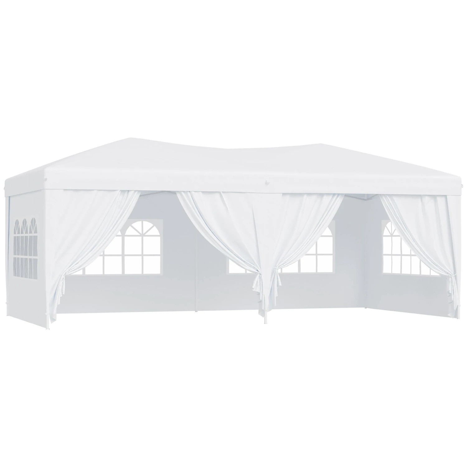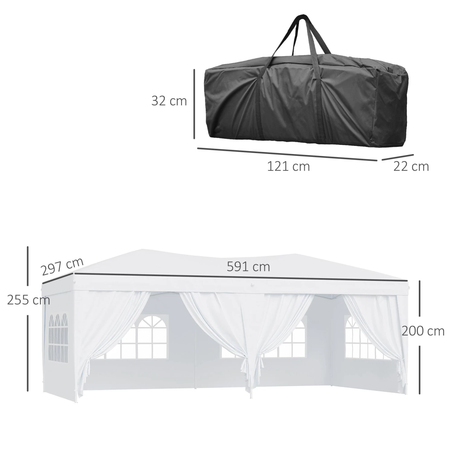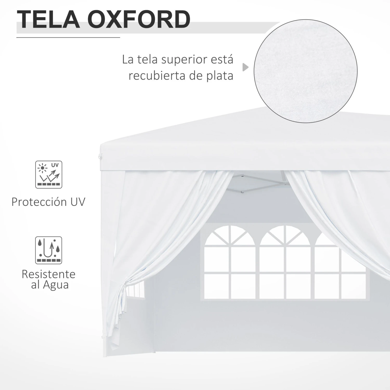 carpa estructura acero con toldo de color blanco con sistema de plegado facil en acordeon. Se puede transportar comodamente a mano e incluye 1 bolsa de transporte. Estructura de acero y techo de tejido oxford duradero y resistente a la intemperie. Esta carpa es ideal para organizar comidas, cenas, fiestas y bodas, y disfrutar en familia al aire libre.características- incluye 6 paredes laterales desmontable: 4 de ventanas y 2 de puertas con cremallera – montaje fácil y rápido sin herramientas mediante sistema de plegado en acordeón – techo de tela oxford resistente de agua de alta calidad con revestimiento plateado resistente a la intemperie , a los rayos uv y al agua. – dispone de único diseño de pegatinas resistente de agua entre costuras de tela que otros no lo tienen. – estructura en tubo de acero lacado, ligero y robusto – carpa plegable en acordeón ahorra espacio cuando no lo utilizes. – fácil de guardar y transportar con una bolsa(incluída) – incluyen todos los tornillos y herramientas necesarias para el montaje – nota: la entrega de este producto se realiza a pie de la calle. Los transportistas no tienen la obligación de subir el producto a su domicilio. Existe desviación por medición manual(±5cm), por favor refiera a artículos reales.especificaciones- color: blanco – material lona: en poliéster – material de los tubos: acero – medidas totales: 5,91×2,97×2,55 m (lxanxal) – medidas de la ventana: 183×83 cm (lxal) – altura del alero: 2 m – incluye 1 bolsa de transporte – referencia: 01-0240