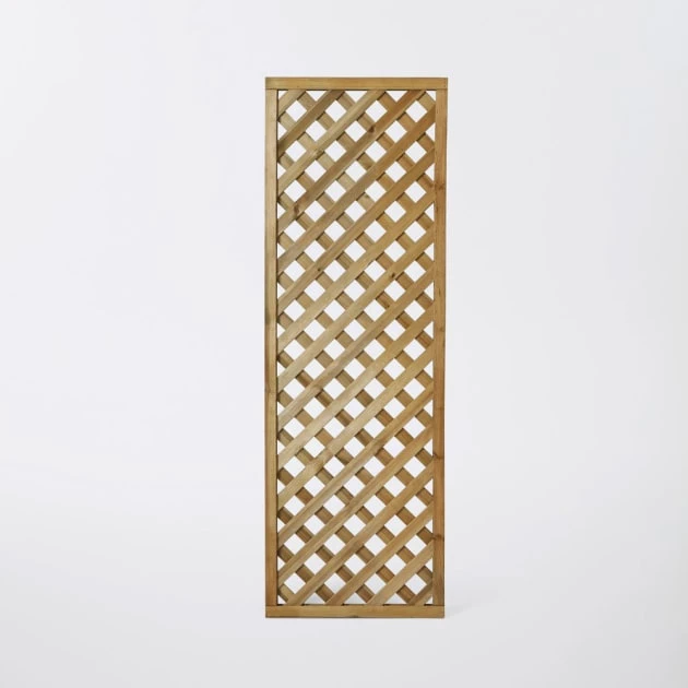 Celosía de madera de pino verde recta, con diseño rectangular y malla en diagonal. Gracias a su tratamiento a presión y protección Autoclave clase III presenta mayor resistencia al exterior evitando que se pudran y con ello aparezcan hongos.Con este panel podrás delimitar la zona exterior de tu hogar y crear espacios íntimos para disfrutar con familia y amigos. Además podrás decorarla a tu gusto con accesorios o plantas entrelazando las ramas con la celosía.