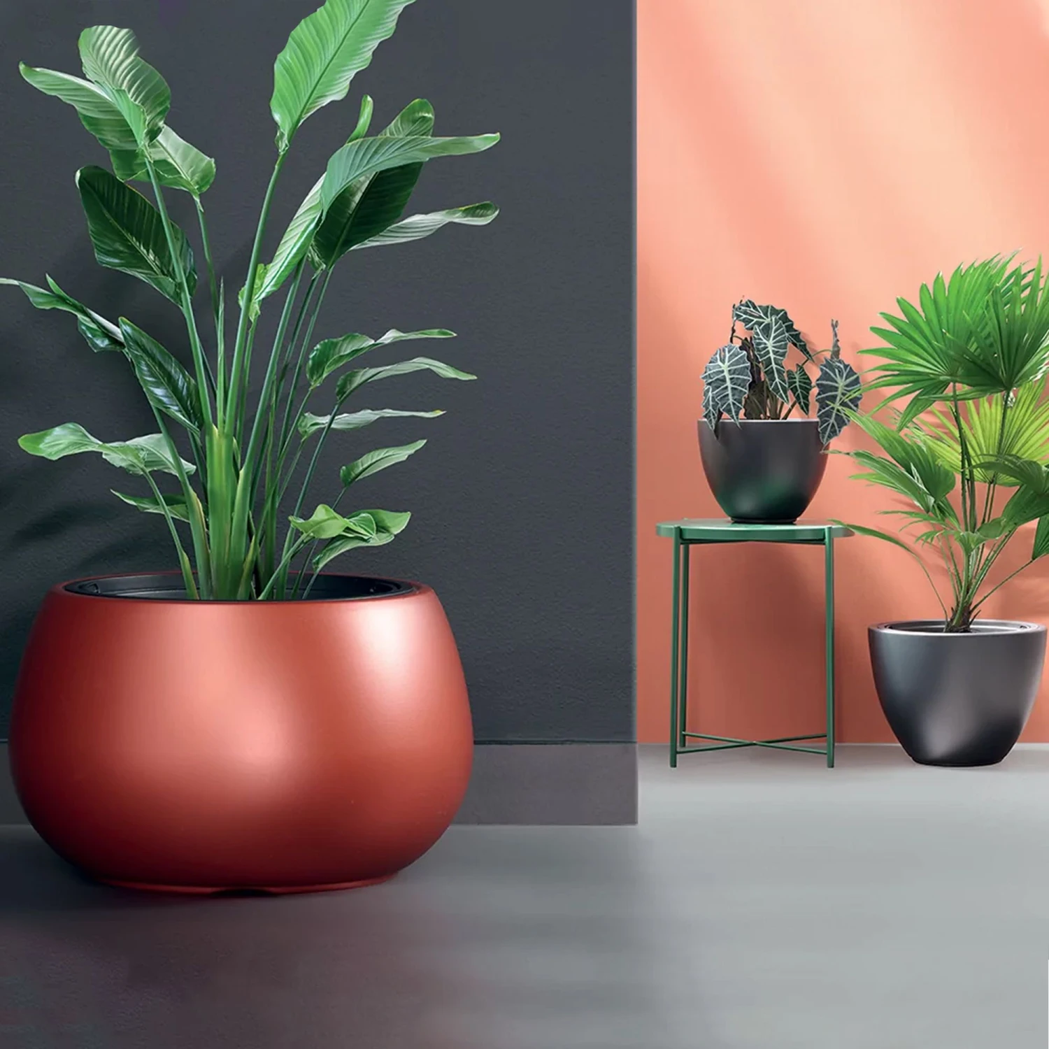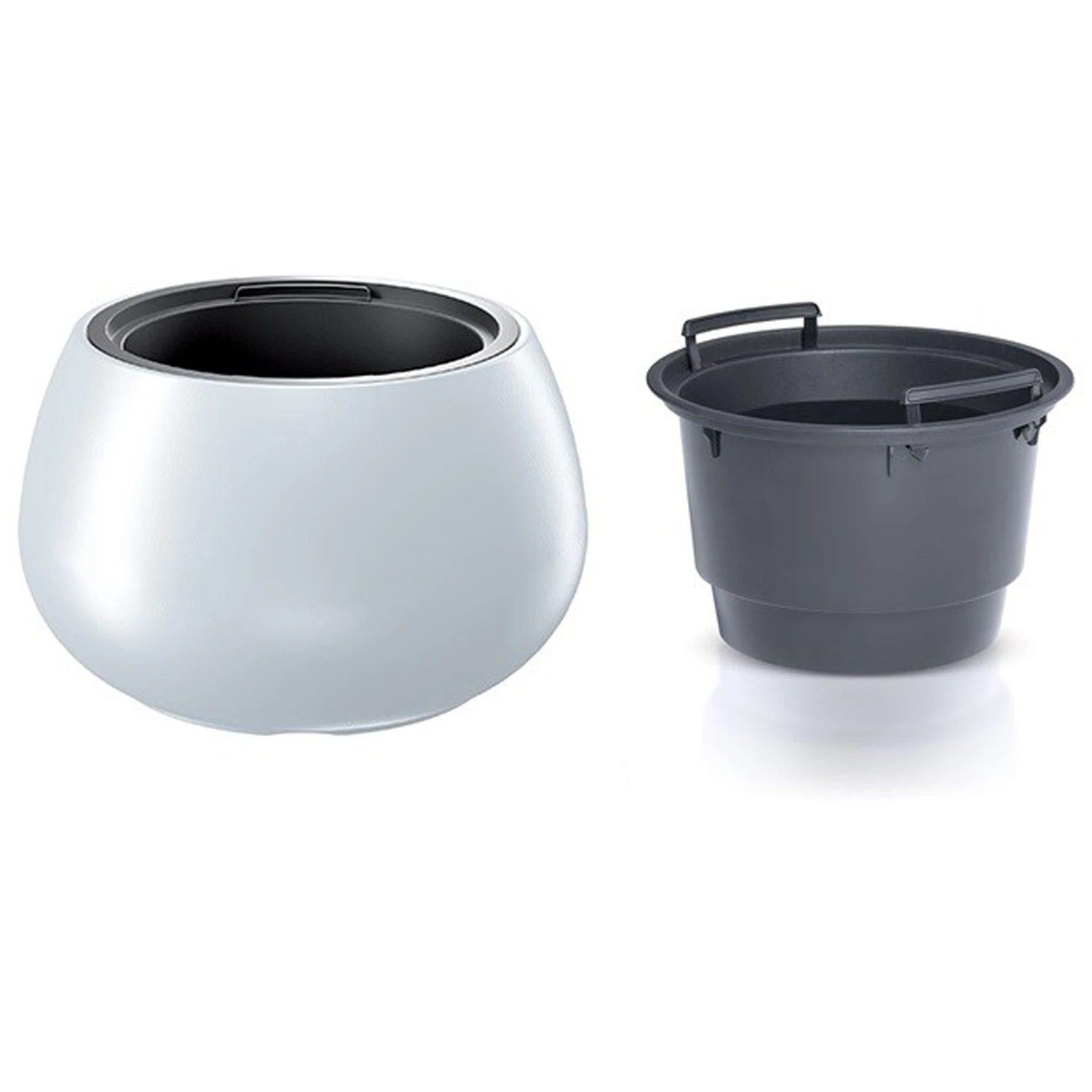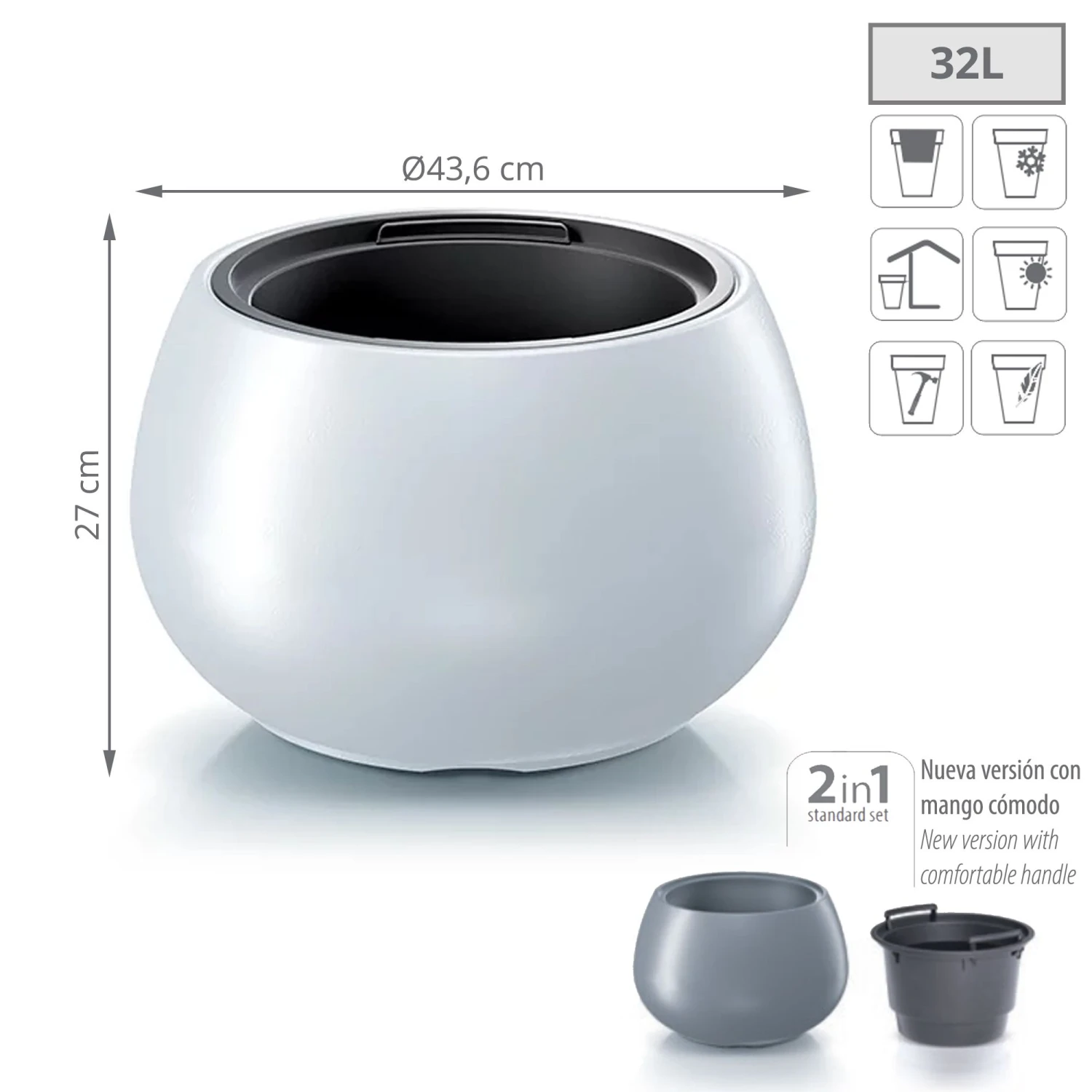 Set 2 en 1: macetero que incluye un depósito interior adaptado que reduce la cantidad de tierra necesaria.