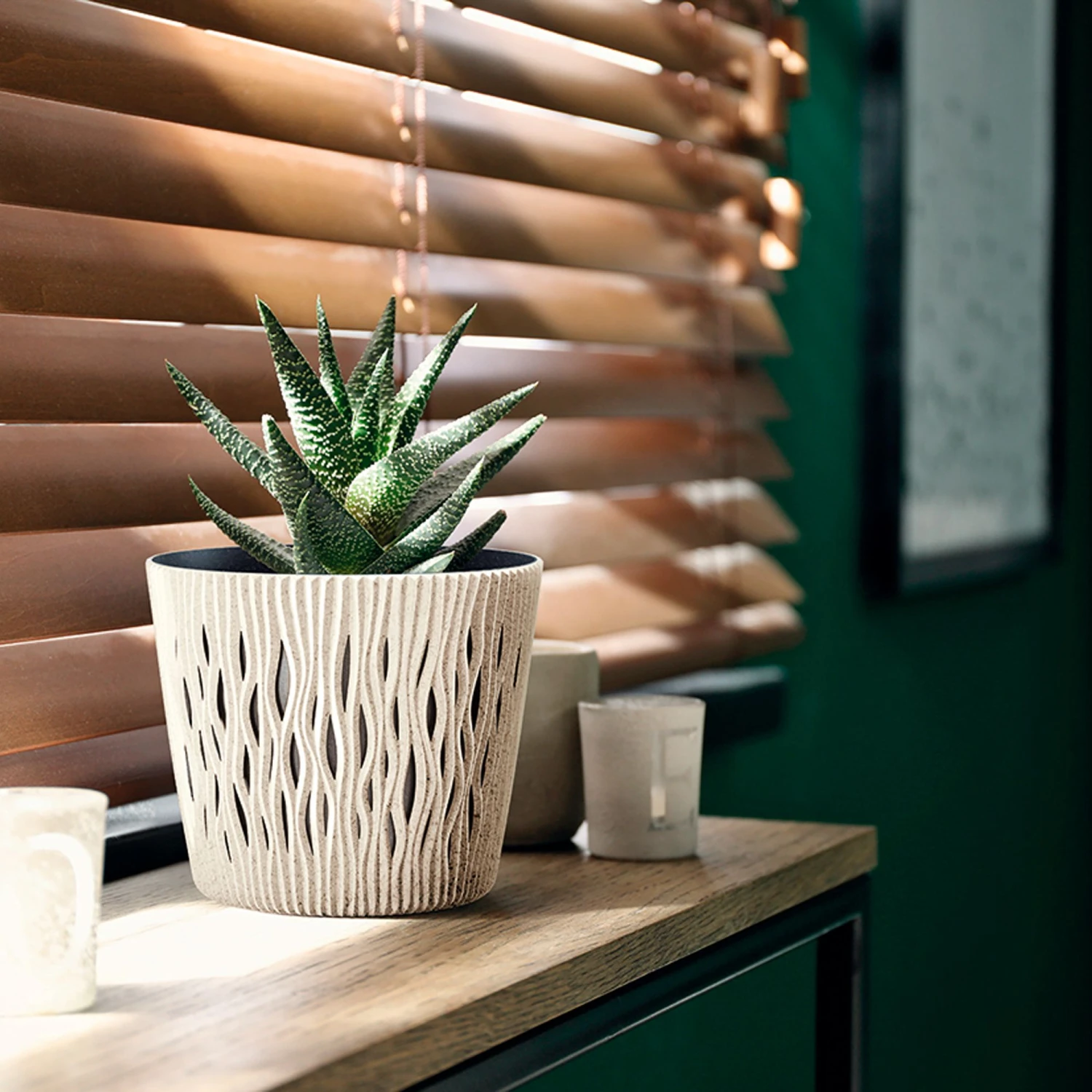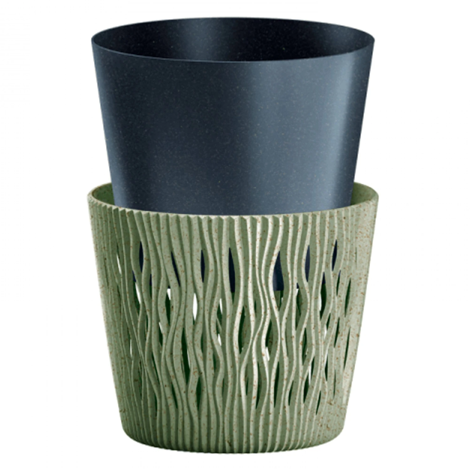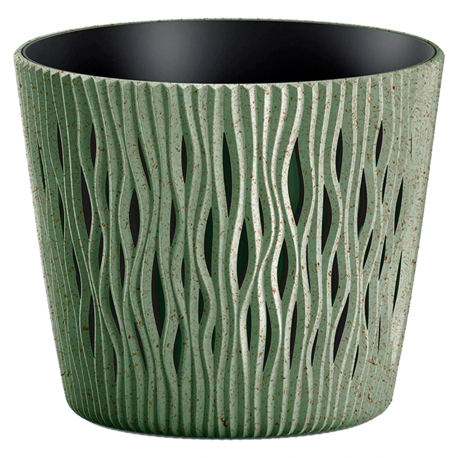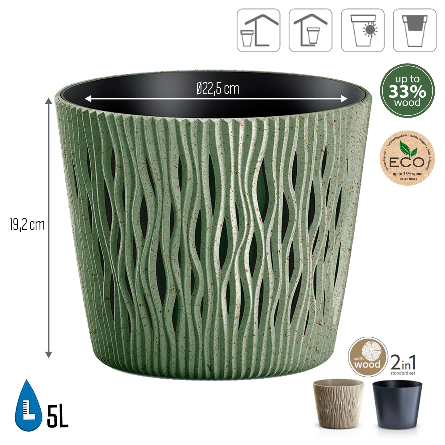 La colección sandy round eco wood tiene como característica principal que está fabricada con un relieve que confiere al macetero un aspecto espectacular.