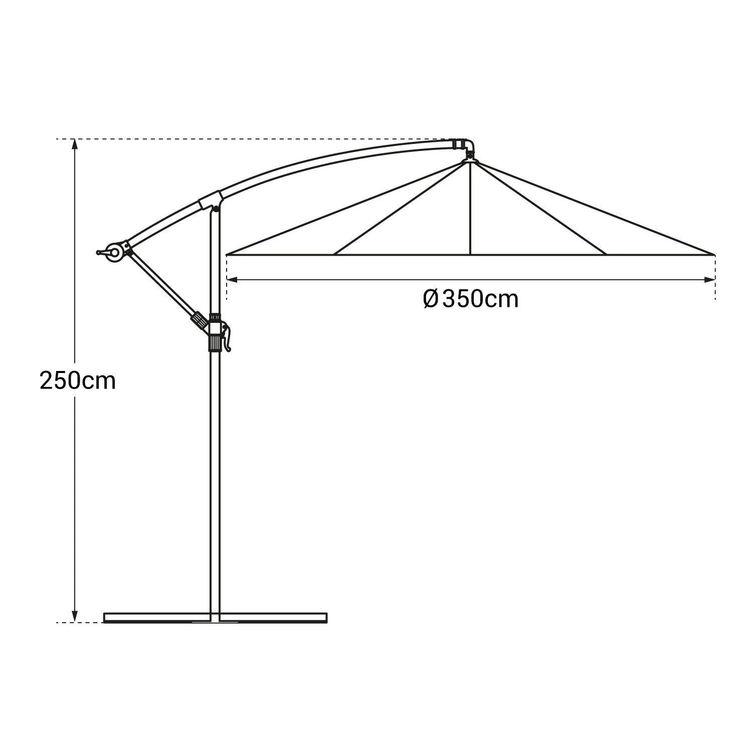 descripción :con una línea clásica y elegante, con nuestra sombrilla oahu de 350 cm, estarás resguardado de los rayos del sol y disfrutarás en paz de tu jardín, tu terraza o tu balcón… Robusto con su estructura de acero recubierta con una pintura epoxi y práctica apertura con su manivela, todos los detalles de nuestro parasol te seducirán. No olvide agregar bases pesadas o de relleno para asegurarse de que su sombrilla excéntrica se mantenga en el suelo. Happy garden también le aconseja que proteja su parasol con una funda protectora cuando no la esté utilizando para protegerla del clima.detalles del producto :dimensiones :- sombrilla : ø 3,5 × al 2,5m- base : l 100 × an 100 × al 4,5cm- mástil : ø 48 × esp. 0,8mm- brazo articulado (largo) : ø 42 × esp. 0,8mm- brazo articulado (corto) : l 26 × an 16 × esp. 0,8mm- varillas : l 18 × an 12 × esp. 0,5mmmateriales :- tela : poliéster 180g/m²- mástil, brazo articulado y base : acero, pintura epoxi- varillas : acero colores :- tela : color topo- mástil, brazo articulado, varillas y base : antracita informaciones complementarias :- tipo de sombrilla : excéntrica- forma de la tela : redonda- número de varillas : 8- tela repelente al agua- ventilación en la parte superior- sistema de apertura / cierre : manivela- forma de la base : cruz- protección solar : tratamiento uv20+- sin montar (instrucciones incluidas)- garantía : 3 añosentrega :la sombrilla excéntrica oahu contiene : 1 sombrillaentrega a pie de calle – entrega en 1 paquetepaquete 1 : l 198 × an 32,5 × al 14cm – peso en bruto : 14,5kg/peso neto : 13kgbueno saber :las bases de sombrilla necesarias para asegurar su estabilidad se venden por separado